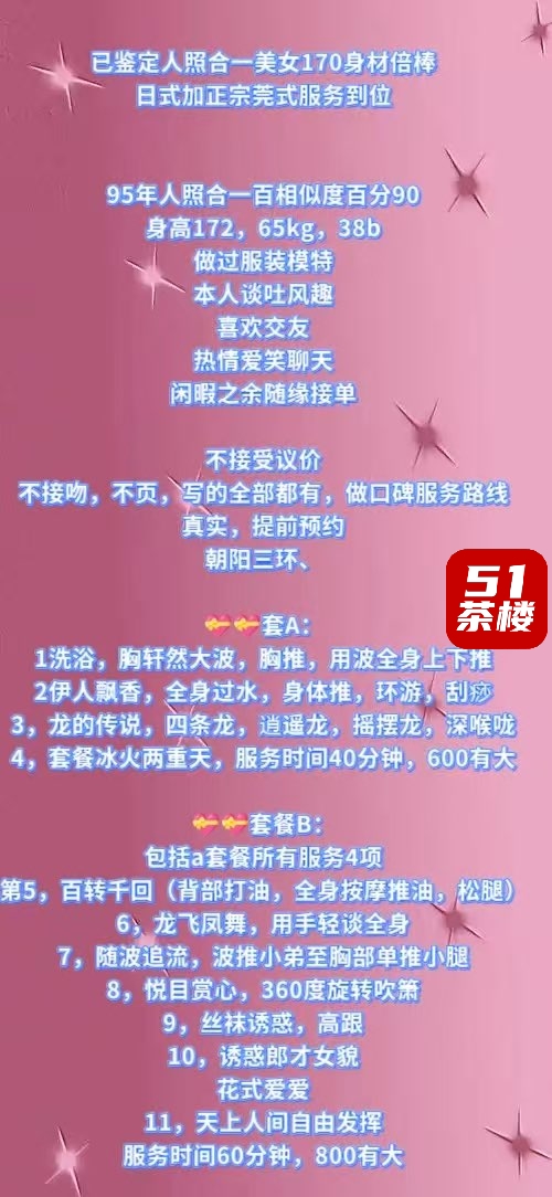 验证日期:2026.3月地 点: 朝阳三环见面感觉:5★身材曲线:5★风情指数:5★技术含量:5★服务项目:全套基本全有(其他自己问)营业时间:约上就行价格一栏:套A:1洗浴,胸轩然大波,胸推,用波全身上下推2伊人飘香,全身过水,身体推,环游,刮痧3,龙的传说,四条龙,逍遥龙,摇摆龙,深喉咙4,套餐冰火两重天,服务时间40分钟,600有大